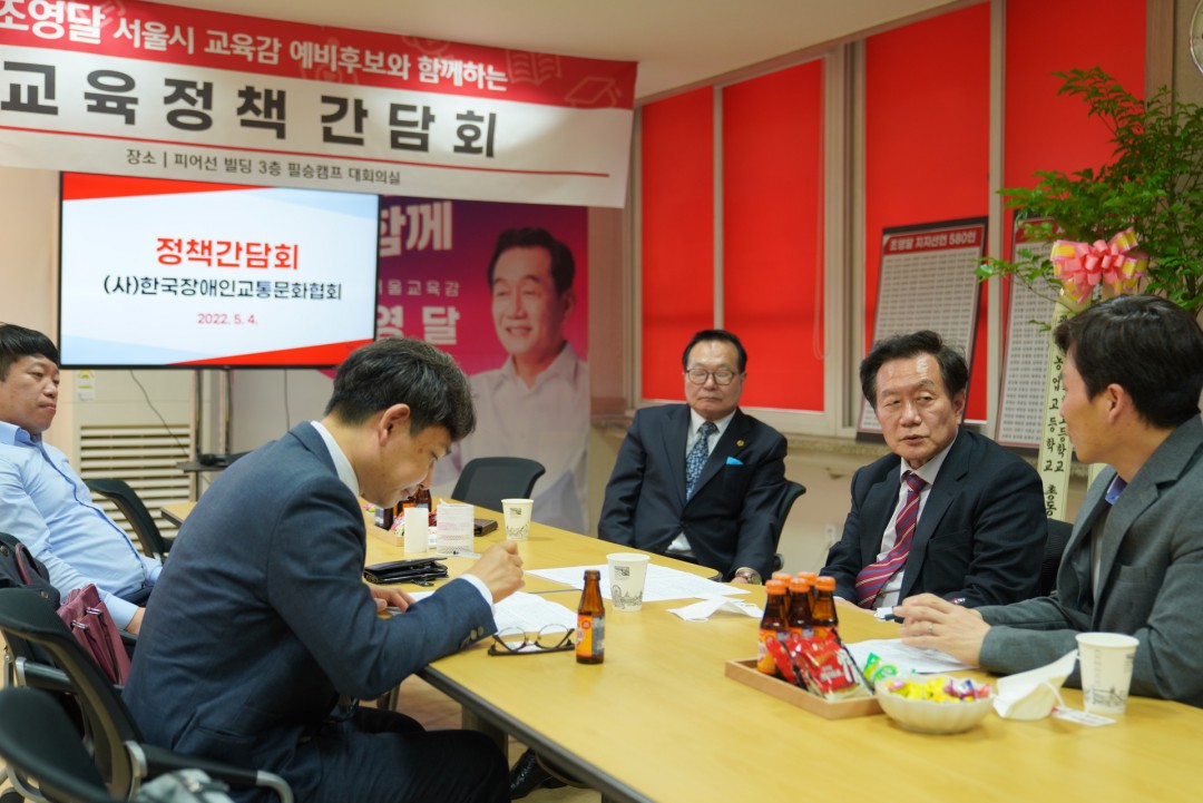 (사)한국장애인교통문화협회 정책간담회 (22년 5월 4일) 페이지 정보 작성자 admin1 댓글 0건 조회 954회 작성일 22-05-17 09:30 본문 서울시 교육감 예비후보 조영달이 캠프에서 (사) 한국장애인교통문화협회에서 정책 간담회를 진행하였다. 목록 이전글강북구걷기협회 조영달 지지선언(22년 5월 11일) 22.05.17 다음글서울시 교육감 조영달 예비후보, 교육대·사범대학생들과 정책협약 체결(22년 5월 3일) 22.05.17